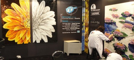 Abbiamo partecipato portando due splendidi mosaici di cui abbiamo dato una dimostrazione di “work in progress”. Le artiste mosaiciste Work House lavoravano al mosaico, tagliando a mano con un particolare attrezzo le tessere in smalto vetroso e applicandole una ad una sul pannello di honeycomb. Si tratta di una tecnica che necessita dell’occhio e della manualità di un’artista, che sia in grado di valorizzare al meglio il prezioso materiale. L’uso degli smalti dona un realismo ed una profondità ineguagliabile all’immagine, riuscendo a catturare la luce che ne esalta le meravigliose sfumature: il risultato finale è assolutamente mozzafiato.